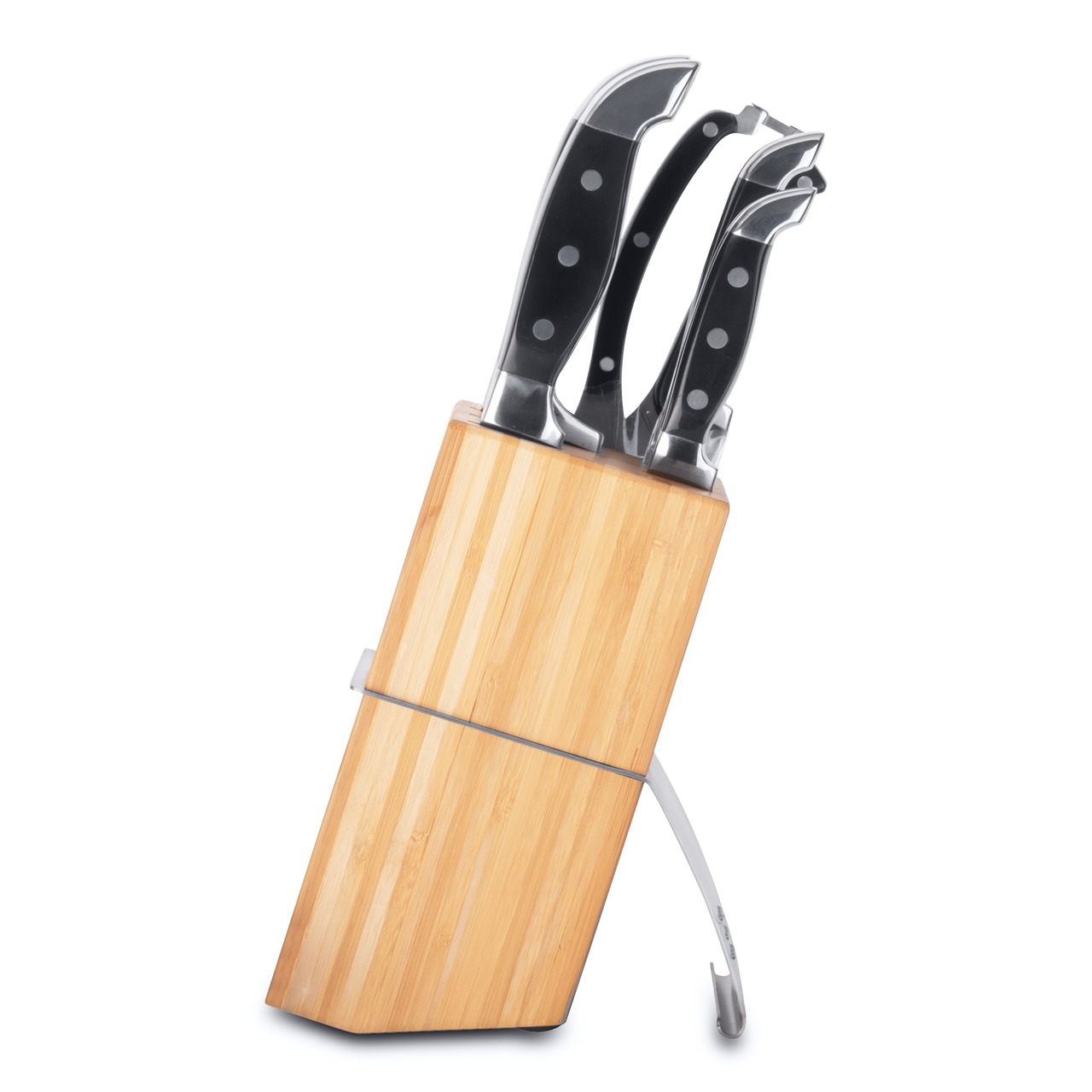 Нож для очистки имеет заостренную верхнюю часть кромки, изгибающуюся вниз при прямом лезвии. Используйте его для очистки овощей и фруктов, для удаления испорченных частей и нарезки декоративных украшений.Универсальный нож идеален для всех нарезочных работ, требующих точности.Поварской нож - самый используемый на кухне. Загнутое кверху лезвие позволяет раскачивать нож во время нарезки на разделочной доске. Благодаря широкому и тяжелому лезвию также подходит для легких разрубочных работ. С помощью ножа для мяса легко нарезать мясо тонкими ломтиками. Часто используется в комбинации с вилкой для мяса, с помощью которой можно удерживать кусок во время нарезания. Нож для хлеба - большой нож с зубчатым лезвием. Используется для нарезания продуктов, твердых снаружи и мягких внутри, таких как хлеб и другая выпечка. Также может использоваться для нарезания томатов. Ножницы для разделки птицы специально разработаны, чтобы прорезать кости, куриную кожу и другие жесткие материалы. Они могут быть использованы как обычные кухонные ножницы, подходящие для целого круга более трудных кухонных нарезочных работ. Колода удобно сохраняет все ножи безопасным образом. Нескользящая платформа обеспечивает дополнительную устойчивость.Тяжелая кованая шейка обеспечивает идеальный баланс и безопасность для рук. Кованая высококачественная нержавеющая сталь, устойчивая к пятнам и коррозии. Заточены вручную. Ручка с тройной клепкой и формой, повышающей комфорт и безопасность захвата. Высококачественные инструменты, долго сохраняющие остроту и простые в уходе. Универсальный набор ножей для всех кулинарных задач.